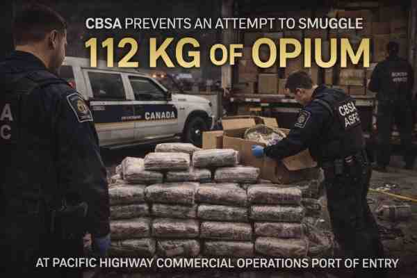 The interception of 112 kilograms of opium at the Pacific Highway Commercial Operations port of entry marks a significant seizure by Canadian border authorities. The operation prevented a large quantity of narcotics from entering Canada and underscores the role of CBSA officers in protecting the country’s borders.
